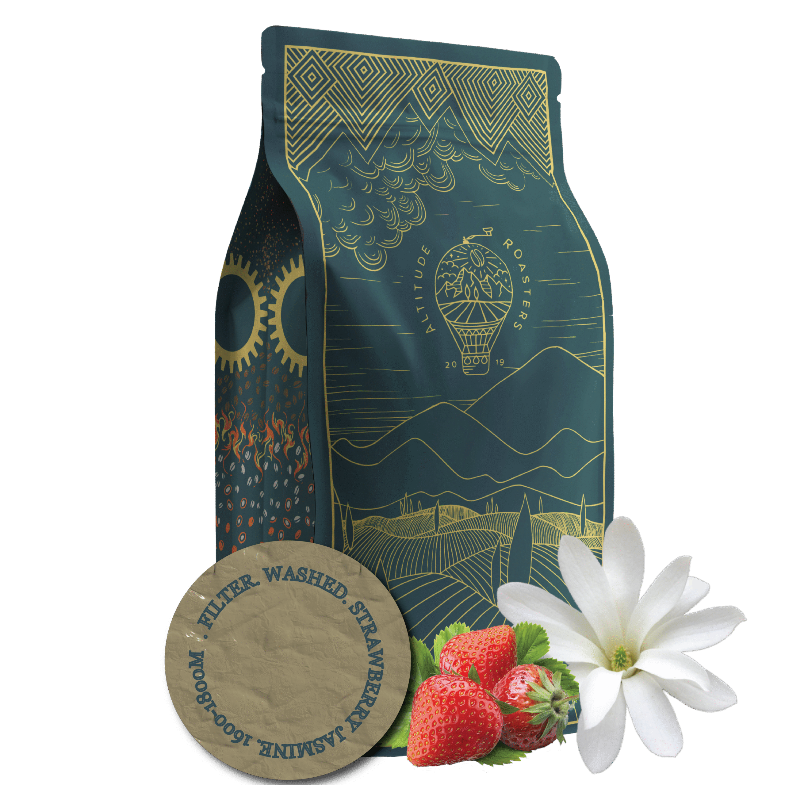 This lot is a blend of the Kenyan Varietals SL28, SL34, Ruiro 11, and batian. Planted at elevations between 1600m to 1800m and processed as washed, it has flavor notes of Strawberry and Jasmine.